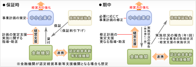 中小企業の皆様は認定経営革新等支援機関の支援を受けながら事業計画を策定実行し、その進捗を金融機関に対して四半期に1回の報告をし、金融機関は経営支援の実地状況を信用保証協会に年1回の報告をします。